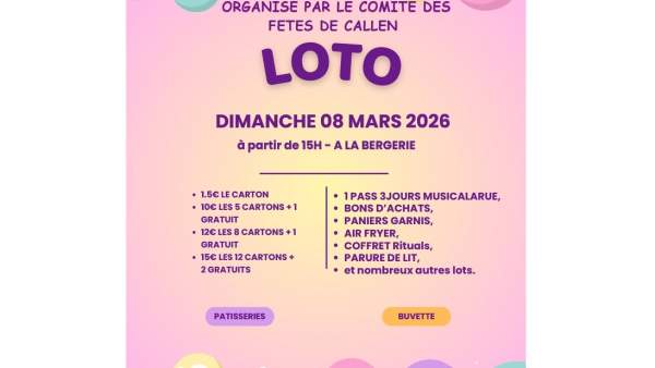 Le 8 mars 2026 un loto organisé par le Comité des Fêtes aura lieu à la Bergerie, à partir de 15H